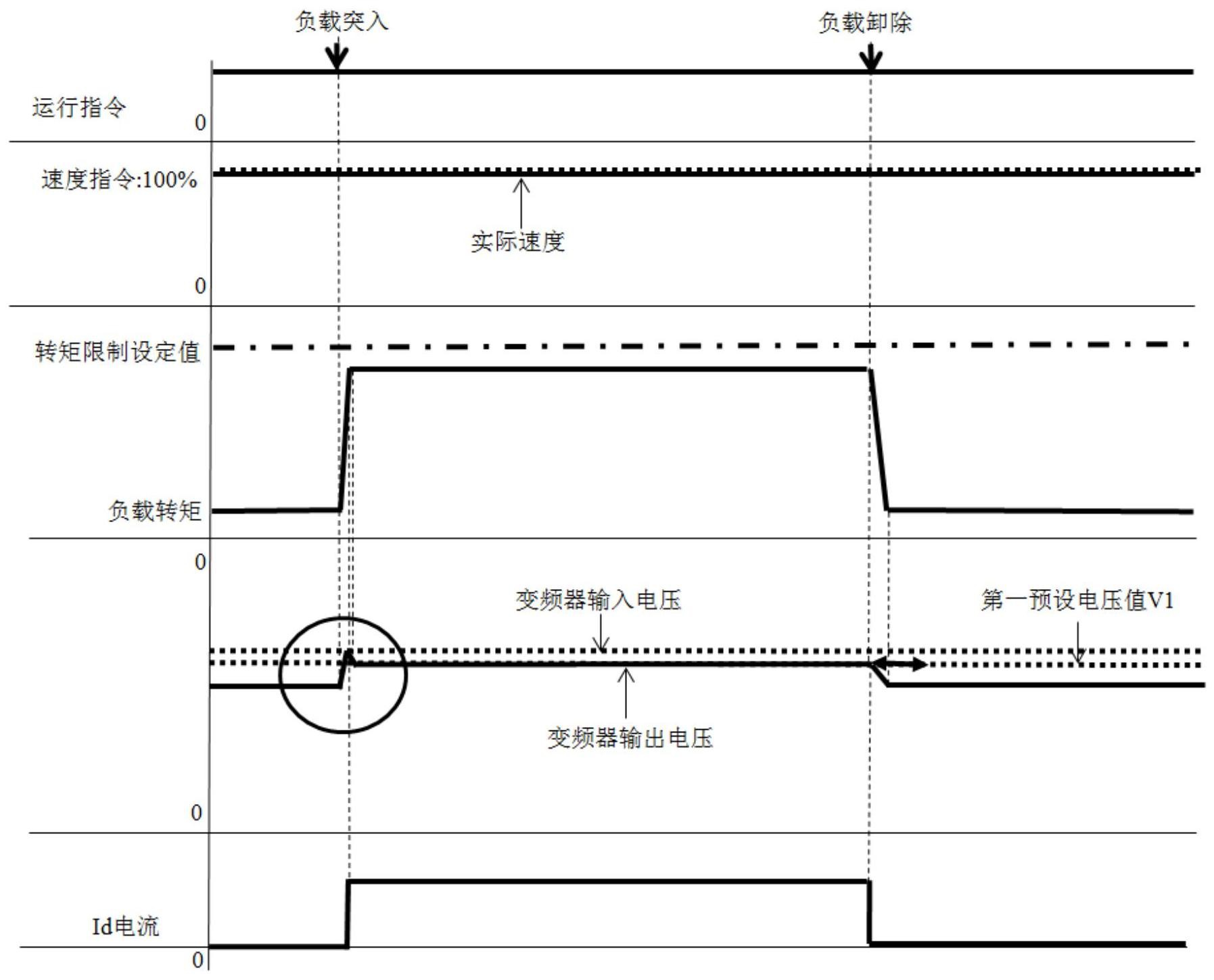 本发明提供了一种控制变频器输出电压的方法、装置、设备及真空系统,在一个实施例中,所述控制变频器输出电压的方法包括:获取变频器的电气参数,所述电气参数为变频器的输出电压或者q轴电流;在所述电气参数增大至对应的设定阈值以上时,向变频器加载d轴电流;所述d轴电流与所述q轴电流配合,使得变频器的输出电压不超过其输入电压。本发明实施例的变频器输出电压控制方法、装置、设备及真空系统可以较佳的避免变频器失去对包括电机在内的工作单元的控制的情况发生。
