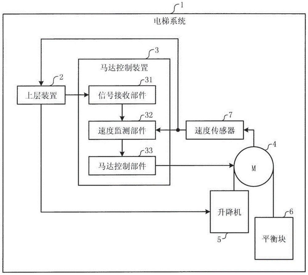 本发明实施方式的一种形态涉及的马达控制装置具备:信号接收部件;速度监测部件;及马达控制部件。信号接收部件从上层装置接收制动器解除信号的输入,该制动器解除信号表示由马达驱动的升降机的制动器被解除。速度监测部件对通过信号接收部件接收到制动器解除信号后的马达的转速进行监测。马达控制部件基于由速度监测部件所监测的转速,生成使马达的所受负荷转矩与马达的旋转转矩之间相平衡的旋转转矩的指令值,并基于该指令值对马达进行动作控制。