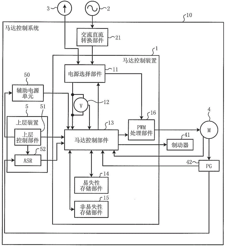 本发明涉及的马达控制装置具备:电源选择部件;电压检测部件;易失性存储部件;以及马达控制部件。电源选择部件将商业用电源或电池电源中的任意一方选择为同步马达的控制用电源。电压检测部件对由电源选择部件所选择的控制用电源所产生的直流母线电压进行检测。易失性存储部件对同步马达的磁极位置进行存储。马达控制部件在由电源选择部件所选择的控制用电源从商业用电源切换至电池电源的期间,在母线电压不低于比通过易失性存储部件能够存储磁极位置的最低电压高的阈值时,基于由易失性存储部件所存储的磁极位置继续同步马达的运行控制。