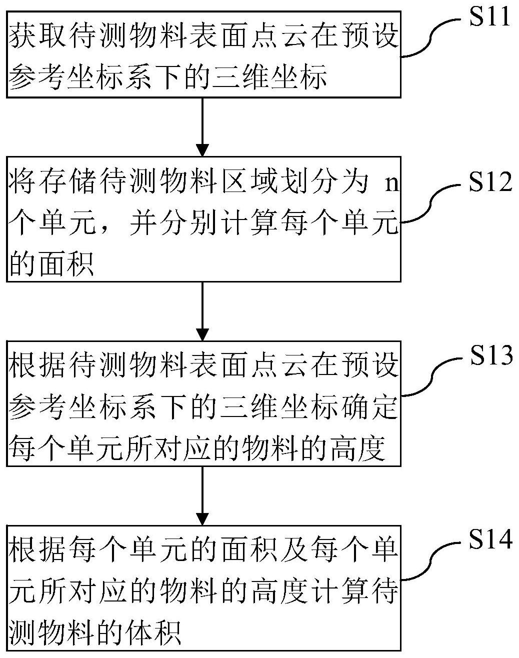 本发明提供了一种库存量计算方法、系统、设备及计算机可读存储介质,所述库存量计算方法包括:获取待测物料表面点云在预设参考坐标系下的三维坐标;将存储待测物料区域划分为n个单元,并分别计算每个单元的面积,n为正整数;根据所述待测物料表面点云在预设参考坐标系下的三维坐标确定每个单元所对应的物料的高度;根据每个单元的面积及每个单元所对应的物料的高度计算所述待测物料的体积。本发明实施例通过将存储待测物料的区域划分为多个单元,并计算每一单元的体积来获取待测物料的库存量,提高了库存量计算的精度。