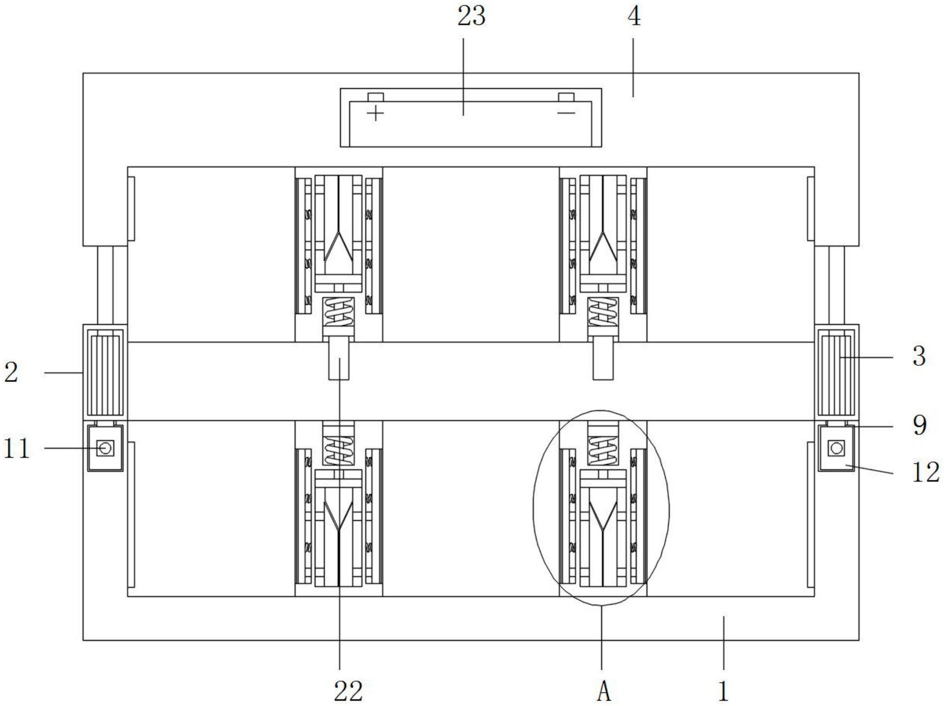 本实用新型涉及一种主机运输存放设备,包括箱体,所述箱体的两侧顶端均滑动设有竖板,所述竖板内均对称固定嵌设有气缸,所述气缸的输出端均延伸至所述竖板的上方且固定连接有与所述箱体相匹配的盖体,所述箱体的底端内壁与所述盖体的顶端内壁上均阵列固定设有多个隔板,所述隔板的两侧均开设有凹槽,所述凹槽内均滑动设有多个连接杆一,位于同一所述凹槽内的所述连接杆一上均固定连接有夹板,所述箱体、盖体的两侧内壁与所述夹板远离所述连接杆一的一侧均固定设有弹性垫,所述箱体的两侧顶端均开设有滑槽一,本实用新型可以方便对主机进行取放,同时可以对主机进行夹持固定,从而有效的提高了装置的实用性。
