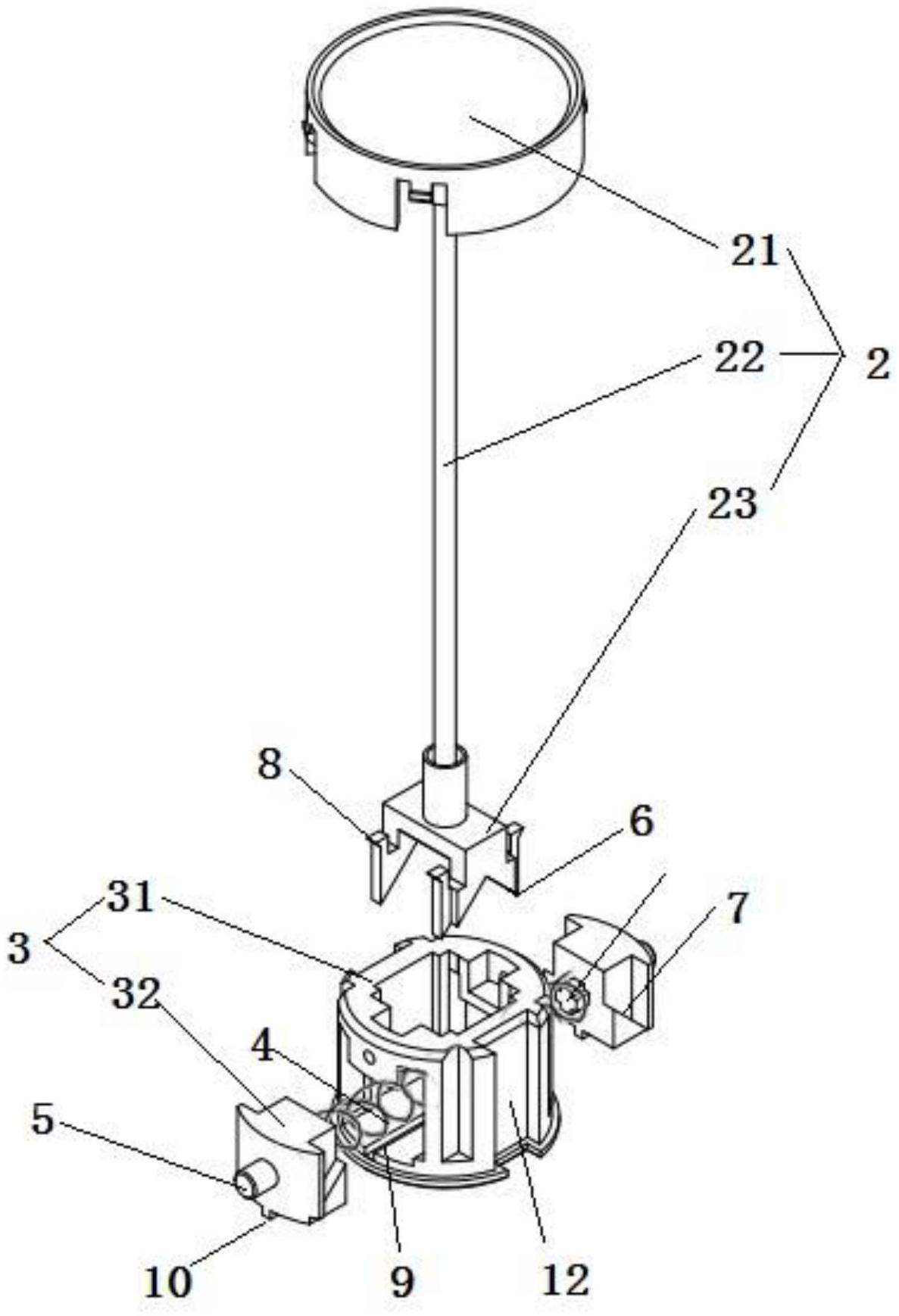 本实用新型公开了一种车把快速拆装结构,旨在提供一种结构简单、方便操作的车把快速拆装结构。它包括插设在前叉套管中的车把套管、按压机构和锁止机构,按压机构包括从上至下依次布置的按压部、连接杆和导向块,锁止机构包括中央固定座和两块左右对称布置的限位块,两块限位块之间设有处在中央固定座内部的弹簧,限位块远离弹簧的一端设有限位柱,车把套管和前叉套管上均设有与限位柱对应的通孔,所述导向块上设有与倒V型支脚,限位块侧壁上设有与支脚底边适配且用于引导导向块上下运动的斜槽。采用本方案,只要轻松按下按压部就能使限位柱回退到车把套管内实现车把快拆,松开按压部,限位柱依靠弹簧之力又能插设到通孔中实现车把快装。