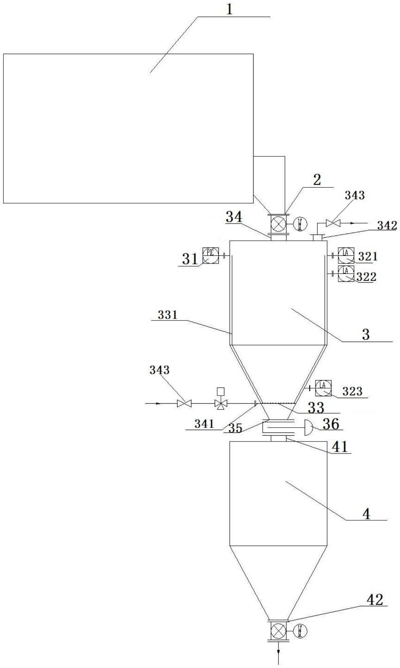 本实用新型涉及一种安全隔离的连续型排料装置,属于工业干燥设备技术领域。所述排料装置包括缓冲仓和出料仓,所述缓冲仓和出料仓均设有进料口与出料口,缓冲仓进料口通过星型卸料阀与干燥装置的卸料口连接,缓冲仓出料口通过开关阀与出料仓进料口连接,所述缓冲仓中设置有换气装置。本实用新型设计的排料装置设置缓冲仓和出料仓两级仓室,缓冲仓实现对干燥装置出料端的封闭,避免干燥装置出料端发生返气和有害干燥气的泄漏,保证产品质量和干燥装置的安全运行,出料仓可以形成连续稳定的出料,提高出料效率。