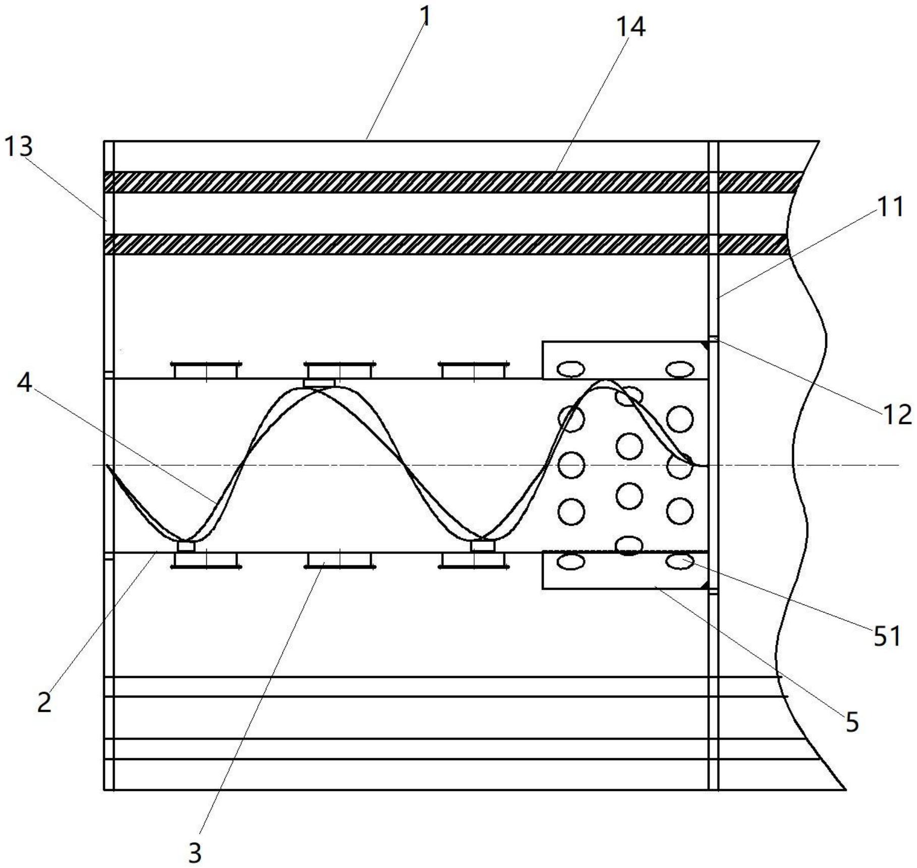 本实用新型涉及一种蒸汽回转干燥机用进料装置,属于工业干燥技术领域。所述进料装置包括套筒,所述套筒通过支架同轴设置在回转干燥机筒体的进料端,所述套筒的内壁上焊接有多道进料螺带,所述套筒的筒壁上沿轴向排列开有多个出料口,所述出料口上焊接有出料管,所述出料管的端部设置有盖板,所述盖板通过调节支架与出料口连接。本实用新型设计的进料装置通过在套筒上开出多个进料口,实现在回转干燥机内的分段落料,出料口的开度可以通过盖板进行调节。