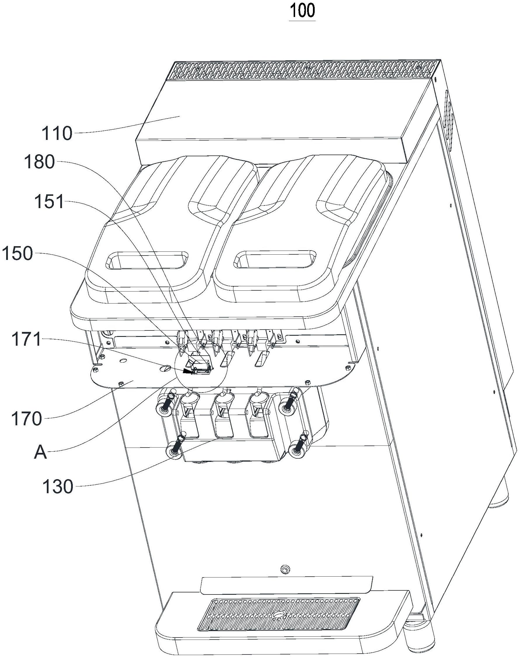 本实用新型实施例提供一种冰淇淋机,属于冷饮食品加工机械技术领域。冰淇淋机包括冰淇淋机本体、出液阀和检测装置,出液阀可拆卸地设置于冰淇淋机本体,且出液阀部分凸出冰淇淋机本体,检测装置设置于冰淇淋机本体的外侧,且与出液阀凸出冰淇淋机本体的部分对应,检测装置用于检测出液阀是否安装。本实施例通过在冰淇淋机本体的外侧设置检测装置,且使得检测装置与出液阀凸出冰淇淋机本体的部分对应,从而就可以自动检测出液阀是否被拆除,从而使用更加安全。