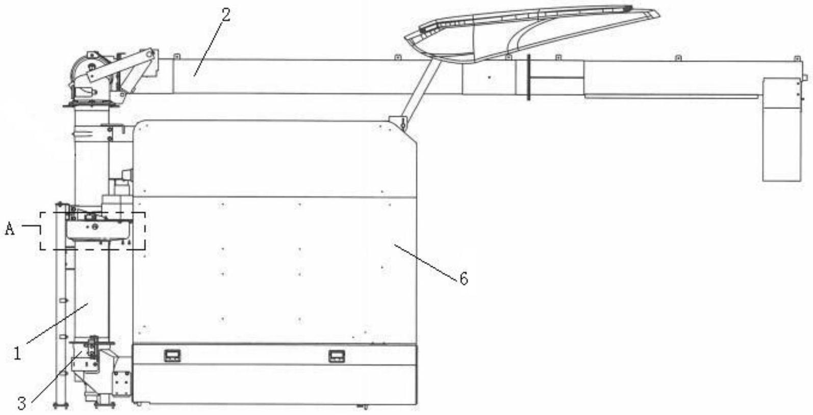 本实用新型公开了收割机卸粮管转动总成及农用收割机,第一管道配置为将收割物从收割机粮仓导出的管体;第二管道配置为对接第一管道并从收割机粮仓上方越过的管体;第二管道与第一管道插套对接,且第二管道基于插套配合而自由枢转;电机驱动第二管道相对于第一管道枢转;限位开关布置于第二管道的枢转路径上以对第二管道的正向枢转或反向枢转限位;切换开关通过控制电路操作电机的转动方向。本收割机卸粮管转动结构简单,安装时无需借助外部设备、无需对机器进行大的改动,通过少量部品的变更就可实现左右旋转的排粮。在收割机作业结束后能快速的进行排粮,增加了用户收割的效率,减少了排粮管旋转的时间,对排粮管旋转电机的使用寿命也得到了提高。