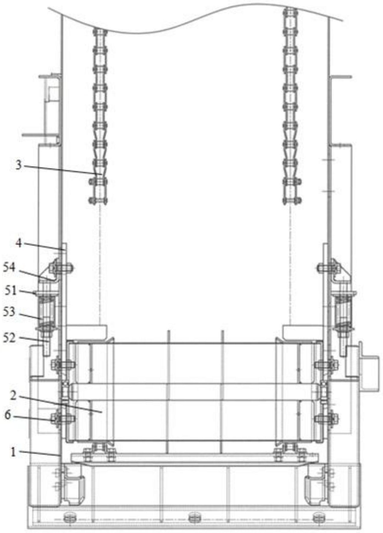 本实用新型公开了一种喂入链条张紧装置,其涉及联合收割机领域。其技术方案要点包括用于支撑喂入链条的喂入滚筒以及喂入部侧板,所述喂入滚筒端部设置有滚筒固定板,所述滚筒固定板与喂入部侧板之间设置有活动限位结构,以及用于实现自动张紧的滚筒自复位结构。本实用新型的张紧装置作用于喂入滚筒来实现喂入链条的自动张紧调节,从而能够有效的减小喂入部因喂入量增加而造成的堵塞现象,且能够降低成本、机器故障率和作业负荷。
