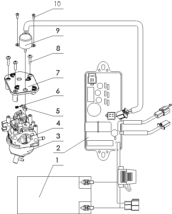 本申请公开了一种小型内燃机化油器阻风门控制装置,属于内燃机发电机组领域,用于阻风门控制,其包括步进电机,所述步进电机的输入端通过导线与电起动模块连接,电起动模块与蓄电池连接;所述步进电机通过步进电机支架安装于化油器上,步进电机的输出轴通过柔性组件和弹簧与化油器阻风门连接。鉴于上述技术方案,其能够在电起动模块检测到点火成功信号后,控制化油器阻风门保持在点火成功的位置一段时间,防止低温冷机等工况下突开阻风门导致熄火的情况。