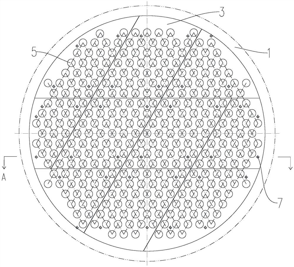 本实用新型属于化工设置制造技术领域,具体为一种催化剂支撑结构,包括下管板、丝网以及由一整块支撑板切分为若干块的板单元,支撑板的形状大小与下管板的下表面的形状大小相同,下管板上设有若干管孔,每块板单元上在对应下管板的管孔的正下方均设有若干通孔,下管板上在远离管孔处设有第一螺栓孔,每块板单元上均设有与第一螺栓孔配合的第二螺栓孔,丝网平铺在下管板的下表面,若干板单元拼接成一整块支撑板位于丝网的下表面,螺栓贯穿第一螺栓孔和第二螺栓孔将板单元和丝网锁合在下管板上,解决了制成的支撑格栅很难保证安装的精度,并且用于制作格栅的扁钢在拼接成格栅后,容易导致扁钢挡住管孔,影响换热管内介质的流动的问题。