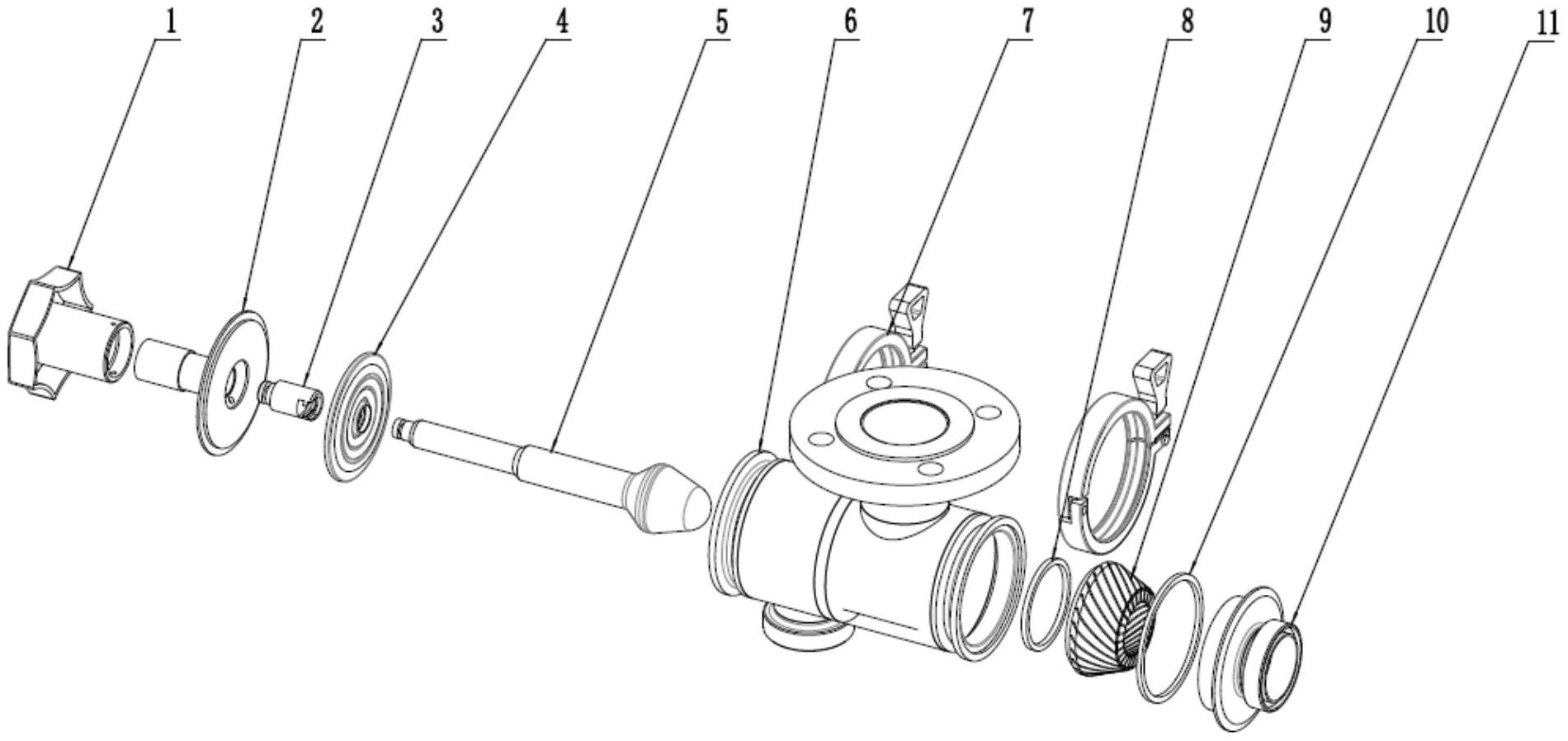 本实用新型公开了一种调节式无菌喷射器,属于喷射器技术领域,其技术方案要点包括喷射器,喷射器由手柄部分、阀芯部分和阀体部分组成,手柄部分从左至右依次包括手柄件、手柄座、联接件和EPDM密封盖,阀芯部分包括阀芯件,阀体部分包括阀体件,阀体件左右两侧的外侧壁均设有有卡箍,阀体件的右端从左至右依次设置有特氟龙密封圈、螺旋式通道蒸汽喷口、氟橡胶密封圈和出口法兰盘,物料通过物料进口进入物料腔,带有一定压力的蒸汽从蒸汽进口进入蒸汽腔,并通过螺旋式通道蒸汽喷口外侧壁的多个蒸汽喷槽进入到混合区,与物料接触,瞬间充分混合,蒸汽运动轨迹呈螺旋式模式,势必将物料全覆盖,温度分布均匀,换热更充分,提高了换热效果。