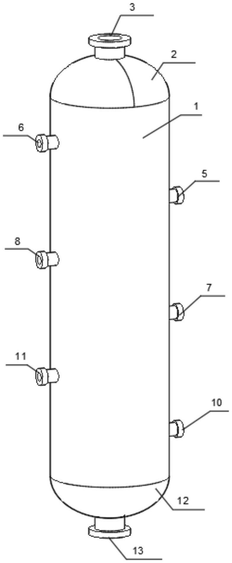 本实用新型公开了一种多股流板壳式换热器,包括壳体,所述壳体的顶端开口处固定装配有上封头,所述上封头的上表面固定装配有工艺介质入口。该多股流板壳式换热器,工艺介质由设备顶端工艺介质入口进入板束,依次经过多个板束,被不同冷媒介质冷凝,从设备底部接管流出,实现能量的梯级利用,采用纯逆流换热流程,充分利用传热温差,换热效率更高,可实现多种流体间的热量交换,壳体为回转壳,起到承压与保护作用,采用圆壳承压,可以承受较高的压力,当换热芯体出现泄漏时,可有效避免高腐蚀性介质、有毒有害介质外漏进入环境中,保护设备外框架,平台不被腐蚀,操作人员不受伤害。