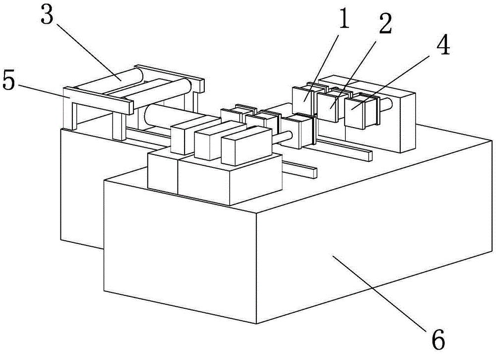 本实用新型提供了一种三夹钳式工件夹紧装置,属于锯床技术领域。它解决了现有的带锯床无法对最后尾料进行处理的问题。本三夹钳式工件夹紧装置包括活动夹钳组、固定夹钳组和多组进给滚筒,进给滚筒沿工件进给方向排布设置在带锯床的床身上,工件夹紧装置还包括有尾料夹钳组,活动夹钳组、固定夹钳组和尾料夹钳组沿工件进给方向依次设置,带锯床的锯带锯切工位位于固定夹钳组和尾料夹钳组之间。与现有技术相比,本三夹钳式工件夹紧装置设置有尾料夹钳组,能够将尾料夹钳进行最后一次的锯切,提高了原料利用率;采用能够升降的料架能够减少工件对机架的压力,增长机器寿命。