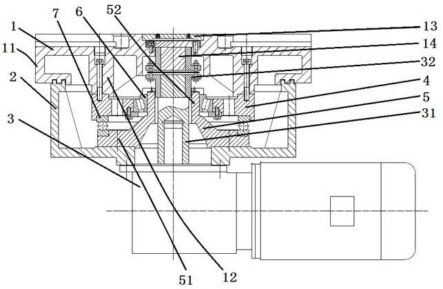 一种立式车磨复合机床圆工作台传动结构,包括圆工作台和工作台底座,工作台底座支撑在圆工作台上且与圆工作台转动配合,在工作台底座的下部固定安装有减速电机,过渡传动轴的下部位于减速电机内并与减速电机联动,过渡传动轴与圆工作台同轴设置,在过渡传动轴的上部设有膜片式连轴器,膜片式联轴器的下端与过渡传动轴固定连接,膜片式联轴器的上端与圆工作台固定连接。选用膜片式连轴器传动转矩,减少减速电机转动对工作台的影响,使工作台转动平稳;在圆工作台和工作台底座设置安装盘和锥型套筒,实现圆工作台和工作台底座的支撑和转动配合,防止圆工作台偏转,提高本实用新型的稳定性和支撑强度;本实用新型整体结构强度大,结构稳定紧凑。