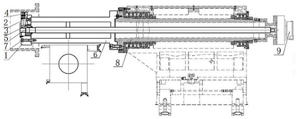 本实用新型公开了一种卧式车床管件加工支撑装置,包括支撑装置和尾座,尾座后端安装有回转液压油缸;所述支撑装置包括夹具体、滑动块、斜块、支撑爪、拉杆轴和支撑体,支撑体与尾座前端固接;拉杆轴与回转液压油缸活塞端相接,拉杆轴沿尾座、及支撑体轴向设置;支撑爪与滑动块连接构成一个宽大支撑爪,滑动块下方设有与其配合使用的斜块,斜块前端与拉杆轴前端连接,斜块后端顶靠在支撑体上;夹具体与支撑体下部连接。本实用新型通过液压油缸驱动拉杆轴拉紧,滑动块与斜块相互作用,使得支撑爪产生外扩张顶紧力,实现管类件内孔的支撑,达到撑紧工件内孔的目的,扩展了卧式车床对管类工件的加工。