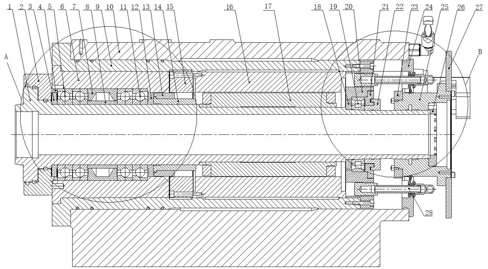 本实用新型属于高精密数控机床设备技术领域,公开了一种超精密数控车床的主轴结构,以解决现有技术主轴中的问题,该主轴结构包括主轴,主轴的一侧装有第一轴承组件,第一轴承组件上装有冷却套筒,主轴的中部装有主轴伺服电机转子,主轴伺服电机转子上装有主轴伺服电机定子,主轴伺服电机定子与冷却套筒之间装有第一主轴连接盘,冷却套筒、第一主轴连接盘及主轴伺服电机定子上套装有主轴套筒,主轴套筒上套装有主轴箱体,主轴的另一侧装有第二轴承组件,主轴的轴端装有第二主轴连接盘,第二主轴连接盘上装有刹车盘。本实用新型采用无键槽无螺纹无间隙精密连接方式,主轴与主轴箱体采用分离式安装结构,可大大提高精密主轴的精度。