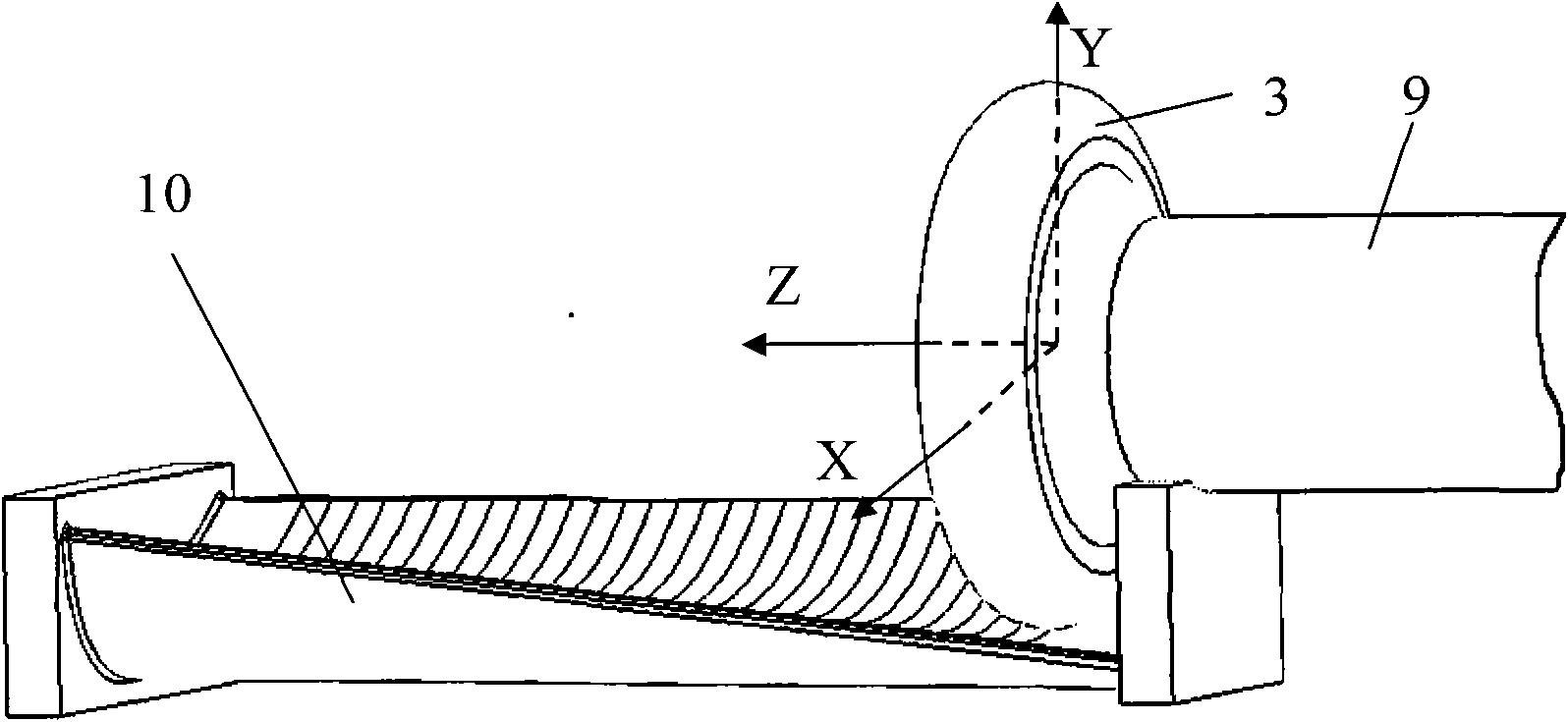 本发明一种叶片曲面无干涉周边磨削的方法,采用四轴联动的磨床设备和砂轮周边圆弧结构,其方法步骤是:1)叶片轴线沿Z轴方向的方式装夹;2)对A轴设置初始摆角α;3)确定待加工点法向磨削半径;4)确定工作台绕B轴旋转β角;5)确定砂轮表面上能与叶片拟合的磨削接触点;6)实施X、Y、Z三轴与B轴的四轴联动;7)重复上述过程,形成连续的磨削轨迹,完成全部磨削加工。本发明具有加工精度好、生产效率高的特点,适用于各种难加工材料和不存在曲率突变的各类叶片曲面的磨削加工。
