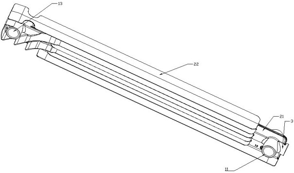本实用新型涉及一种高效复合压铸铝散热器,包括若干并列分布的散热单元连接而成,所述散热单元包括一钢管水道和设置在所述钢管水道外部的散热翅片,所述散热翅片为铝压铸件;竖直连接管的内壁上开设有若干第一圆弧形凹槽,且第一凹槽与竖直连接管的内壁采用圆弧过渡,增大热媒水与竖直连接管的接触面积,同时减少竖直连接管的壁厚,使得热媒水通过竖直连接管所辐射的热量快速的扩散至散热通道处,提高保温性与热传递性,每个散热翅片的一侧面上均开设有第二圆弧形凹槽,另一侧面上对应于第二凹槽位置处均设有与第二圆弧形凹槽同心的弧形凸起,在不增加散热翅片厚度的同时增大散热翅片与空气的接触面积,提高热辐射效率。