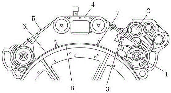 本实用新型公开了一种降低功耗盖板传动系统,涉及梳理机技术领域,本实用新型包括盖板轴和刷辊轴,所述盖板轴与盖板连接,所述刷辊轴设置于盖板轴上方,所述盖板轴一侧表面与刷辊轴之间分别连接有后滑块、中间滑块和前滑块,所述后滑块与中间滑块滑动配合,所述中间滑块与前滑块滑动配合,所述盖板轴内侧一表面连接有曲轨嵌条,所述曲轨嵌条安装于盖板表面,所述曲轨嵌条一侧表面连接有盖板骨,所述盖板骨一侧连接有同步带,所述曲轨嵌条连接于同步带内表面。本实用新型一种降低功耗盖板传动系统,通过对传动系统及润滑进行优化,降低盖板传动功耗,有效为用户节省运行成本。
