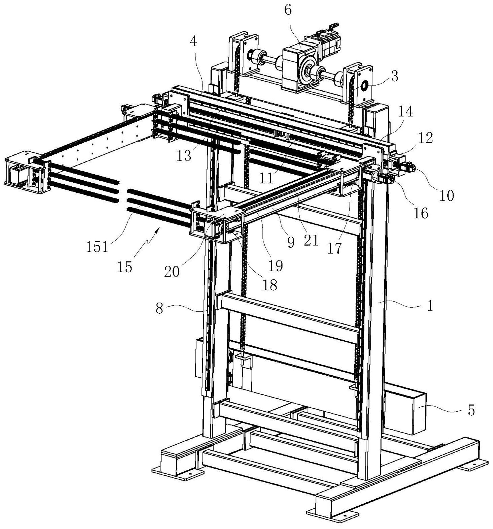 本实用新型公开了一种自动理垛机,涉及码垛技术领域。包括机架,升降装置,两个第一拍齐装置,以及第二拍齐装置,升降装置包括由第一驱动机构驱动转动设置在机架顶部的链轮,绕设在链轮上的链条,以及滑动设置在机架上的安装座和配重箱,链条的一端连接安装座,链条的另一端连接配重箱;第一拍齐装置包括设置在安装座上的第二驱动机构和由第二驱动机构驱动滑动设置在安装座上的第一拍齐臂;第二拍齐装置包括设置在第一拍齐臂上的第三驱动机构和由第三驱动机构驱动滑动设置在第一拍齐臂上的两个第二拍齐臂。本实用新型自动理垛机消除了码垛间隙,使码垛后的产品堆叠排布更加紧密。
