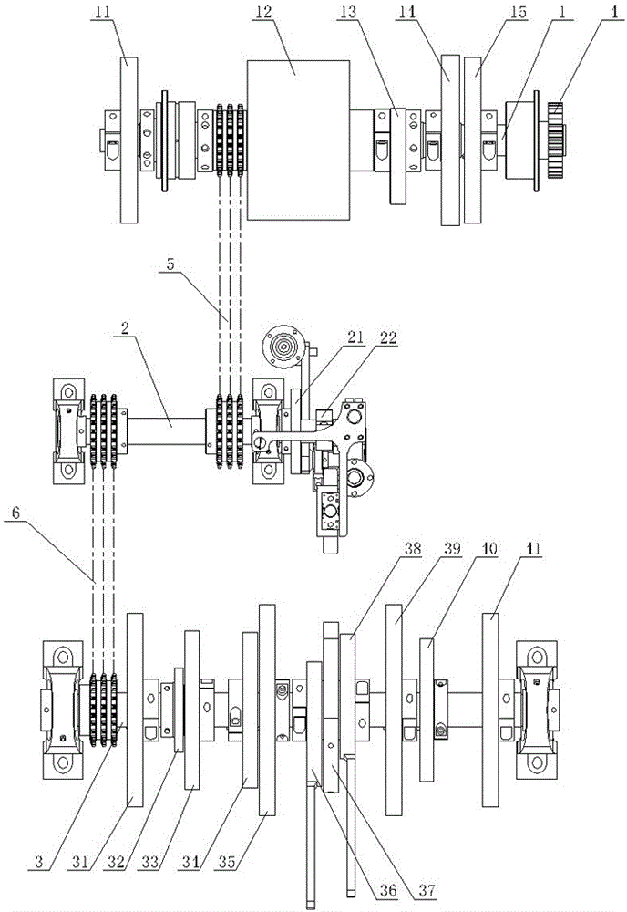 本实用新型公开了纸碗机传动机构,其特征在于:具有平行设置的槽轮轴、过渡轴和包叶轴,槽轮轴与主电机传动连接,槽轮轴通过第一链轮组传动过渡轴,过渡轴通过第二链轮组传动包叶轴,槽轮轴上安装左滚花凸轮、槽轮、压花凸轮、卷边凸轮和右滚花凸轮,过渡轴上安装顶杯筒偏心轮和打杯偏心块,包叶轴上安装左粘合凸轮、冲底偏心轮、杯底延伸凸轮、吸纸凸轮、左包叶凸轮、勾杯筒偏心轮、顶杆凸轮、送纸偏心轮、右包叶凸轮、翻杯凸轮和右粘合凸轮。本实用新型利用三条传动轴来实现纸碗机的整个传动要求,传动效率高,结构简单,有利于纸碗机的优化设计。