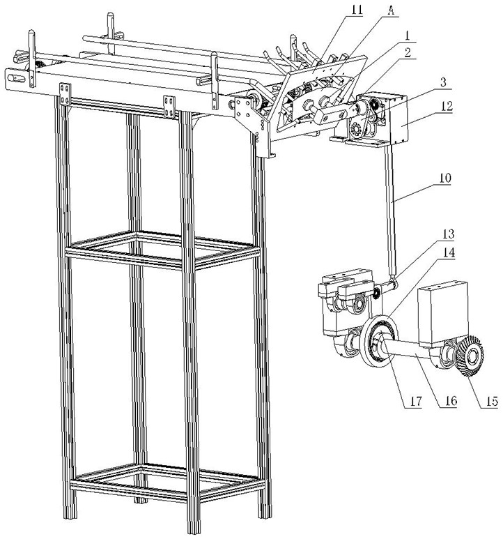 本实用新型公开了纸杯机取放纸片机构,其特征在于:包括吸嘴,吸嘴工作时从纸片存储输送台上吸取纸片,吸嘴设置于横杆上,横杆的内侧杆端可转动设于主摆臂上,主摆臂固定连接主摆臂轴,主摆臂轴可转动设于固定支座上,主摆臂轴的转动由拉杆的上下活动进行推动,横杆的内侧杆端还与摆动曲柄固定连接,摆动曲柄的另一端通过曲柄轴转动连接副摆臂,副摆臂通过副摆臂轴可转动设于固定支座上,副摆臂轴位于主摆臂轴的上方。本实用新型可实现稳定可靠的取放纸片动作,结构简单紧凑,保证纸杯机生产速度的提高。