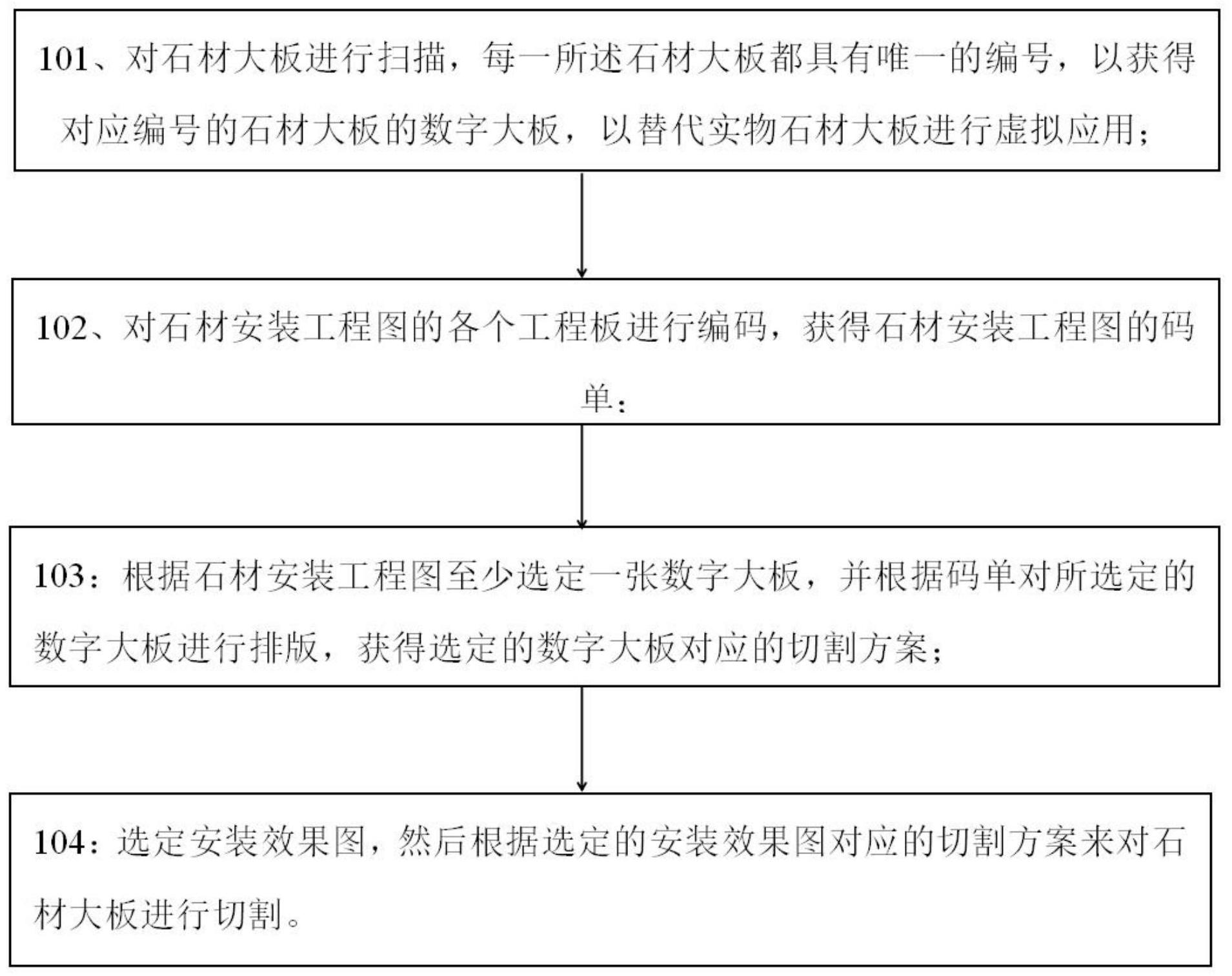 本发明公开了一种石材3P加工方法及系统,该方法包括对石材大板进行扫描,每一所述石材大板都具有独立的编号,以获得对应编号的石材数字大板;根据石材安装工程图至少选定一张数字大板,并根据要求对石材大板进行虚拟排版,获得不同排版方案所对应安装效果图;选定安装效果图,然后根据所选定的安装效果图所对应的切割方案来对石材大板进行自动切割。本发明克服了传统作业模式销售困难,客户无法浏览大板;工程应用中结果不能精确预知,效率不能充分发挥,材料不能极致利用,质量不能有效保证,现场不能有效管的弊端。