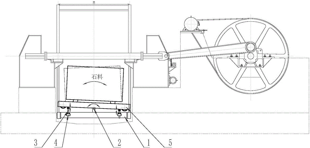 本实用新型公开了一种石料摆动切割的摆动台架,其中减速机4可以驱动丝杆3作升降运动,而丝杆3可以驱动料车5以绞支轴运动副2的旋转轴线为中心进行往复摆动,使得料车5中的石料摆动,实现石料与锯条以圆弧切线的方式接触,实现摆动切割。本实用新型打破了传统的平行切割方式,有利于减小切割过程中锯条与石料的接触面积,从而刀头在较小压力下即可产生较大的压强,因此切割下刀速度快,锯条使用寿命长,切割成的板材平整度好,对锯条张紧力要求低,可使用更薄基体的锯条,扩大了适于切割石料的硬度范围;同时由于接触长度短,石料加工过程中有一定倾斜,使切割产生的颗粒更加方便排出。