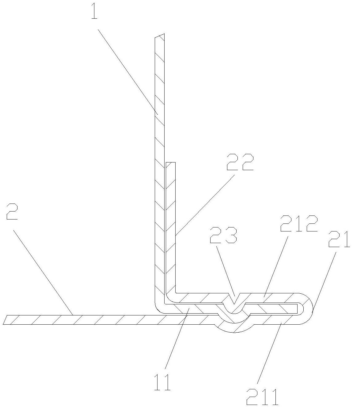 一种自密封防松脱的铆合装置,包括第一连接板和第二连接板,第一连接板设有直角折叠边;第二连接板的端部设有对折夹紧单元,所述对折夹紧单元紧密包覆在直角折叠边上、下两表面,定义贴紧直角折叠边上表面的部分为上对折夹紧单元,定义贴紧直角折叠边上表面的下表面的部分为下对折夹紧单元;上对折夹紧单元的端部连接有端部定位部,用于顶紧第一连接板;上对折夹紧单元、直角折叠边以及下对折夹紧单元的同一位点上通过互相卡配的第一铆合凸起铆合在一起。本实用新型的有益效果是:在钣金成型咬合过程中,增加凸点定位,提高铆合力,密封性好。