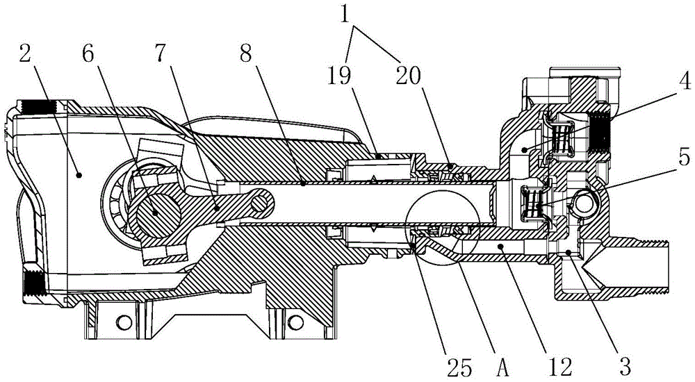 本实用新型属于柱塞水泵技术领域,特指一种柱塞水泵的水润滑结构,包括有泵体,泵体上开设有动力腔室、进水腔室、以及高压腔室,进水腔室与高压腔室之间通过单向阀连通,动力腔室与高压腔室之间通过柱塞孔连通,动力腔室上转动连接有曲轴,曲轴通过连杆与柱塞杆传动连接,柱塞杆滑动连接在柱塞孔内,且柱塞杆与柱塞孔之间设置有柱塞环,位于柱塞环两侧的柱塞杆与柱塞孔之间分别设置有密封圈一与密封圈二,泵体上开设有注水通道。本实用新型进水腔室的常压水通过注水通道引流至润滑空间内,使得柱塞环与柱塞杆之间能够进行水润滑,借助密封圈一与密封圈二有效阻止润滑空间的常压水进入至动力腔室内、高压腔室的高压水进入至润滑空间内。