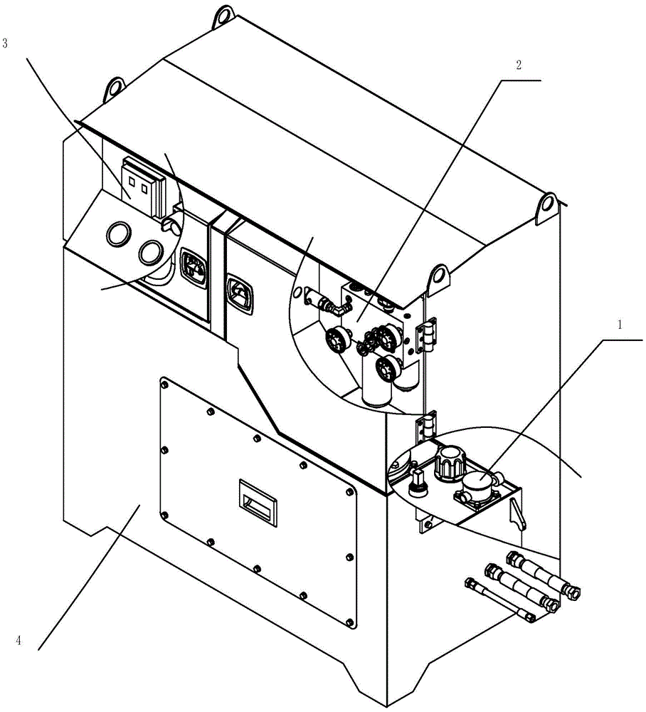 本实用新型涉及液压系统领域,具体涉及一种集成式液压供控单元,包括液压站、液压阀组、电控合件和集成柜。本实用新型是将液压站、液压阀组、电控合件集成在一个紧凑的集成柜里,在集成柜的四周加装可拆卸的防护板,且对经常需要人工操作的操控面板和液压阀组进行内嵌,外部安装防砸的可开启的防护罩,使液压、电气和控制面板高度集成并进行防护形成一个独立的供控单元。利用供控单元的集成性和独立性,可放置在远离物料散落或飞溅的区域,可避免液压供给和控制所使用的元器件难以防护易被损坏的风险。