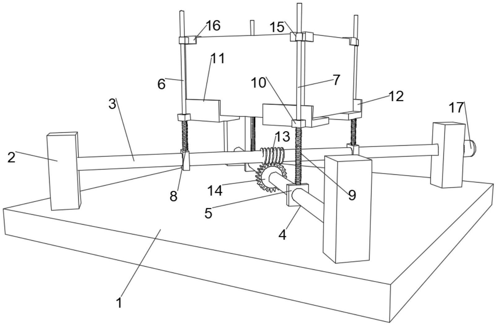 本实用新型公开了一种包装机械用固定装置,包括底板,四个支撑杆中对角线上的两个支撑杆之间分别转动连接有一号丝杆和二号丝杆,一号丝杆外表面设有螺旋纹,二号丝杆外表面固定连接有涡轮,两个滑块顶部分别固定连接有一号固定柱和二号固定柱,一号固定柱和二号固定柱外表面分别套设有一号弹簧和二号弹簧,两个一号固定柱和二号固定柱一侧分别设有一号承重板和二号承重板,两个一号固定柱和二号固定柱外表面均螺纹连接有连接环,连接环外表面通过圆环转动连接有卡块。该装置便于对箱体进行固定,固定效果更好,并且还能减小对箱体的损坏,还便于固定不同大小的箱体,可以根据实际情况调整固定位置大小和高度,实用性更强。