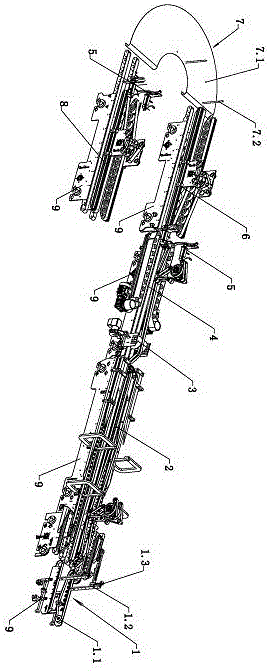 本实用新型公开了一种内衬盒智能折叠生产线,在机架上贯穿地设置有折叠纸板的折叠通道,沿所述折叠通道从前至后依次设置有给纸装置、多道折叠成型机、筒盒折叠机械手、三面输送装置、端边内折器、前端壁折叠机、转向输送机、端边内折器和后端壁折叠机;多道折叠成型机包括沿折叠通道中心线的左右两侧还对称地设置有一道折叠导轨、二道折叠导轨、三道折叠导轨和四道折叠导轨;筒盒折叠机械手包括铰支于机架上的握持托板和握持转盘;端边内折器包括端边内折爪;所述前端壁折叠机包括端折下输送带和外端抬折装置。该内衬盒智能折叠生产线,不仅能进行复杂结构和筒管盒壁内衬盒的折叠成型,而且折叠成型质量好、生产效率高。