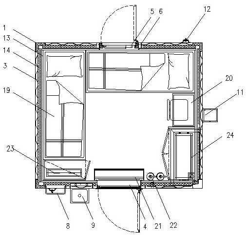 本实用新型涉及海上风电运维领域,提供了一种海上风电运维舱。通过在舱体的内部及顶板上设置多层保温防护层,提高舱体的保温和防漏性能;通过安装照明、通风及空调系统,增加舱内的舒适性;通过设置灭火器、应急照明灯设置,提高运维舱的应急能力;本技术方案不仅具备舒适的生活配套,还配备了标准的办公、休息设置、应急配套,能够充分满足海上运维的工作需求。