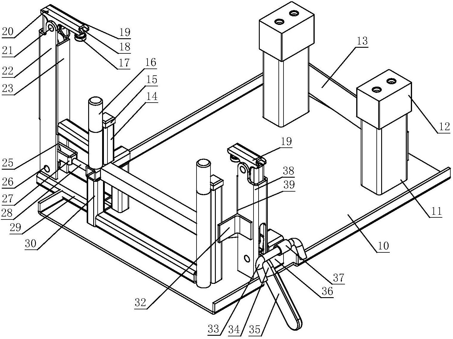 本实用新型公开了一种新型发动机运输架联动工装总成,其包括工装底板、设于该工装底板上的支撑柱总成、油底壳支撑总成,工装底板上还设置有与支撑柱总成相对应且分处于待运输发动机两侧的竖直高滑槽、竖直矮滑槽,在该竖直高滑槽、竖直矮滑槽顶部均铰链有翻转压板,该翻转压板上均设置有可将待运输发动机压紧定位于支撑柱总成上的压销,并在竖直高滑槽、竖直矮滑槽的槽内分别设置有与翻转压板组成杠杆机构的连接板,在竖直高滑槽、竖直矮滑槽下部槽内分别铰链有与连接板组成杠杆机构的联动座,两联动座通过连接杆固连,且在工装底板上设置有用于控制连接杆使得压销上下移动的手柄。该实用新型稳定可靠,且使用方便快捷。