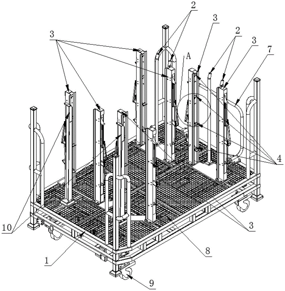 本实用新型涉及一种双工位自动牵引高精度料框,其特征在于:包括底框、导向限位机构、自动牵引机构及行走机构;导向限位机构包括多个按待装零件外部结构形状垂直设于底框上的导向杆、限位杆,以及多个沿竖直方向且间隔预定距离设于限位杆上的活动限位件;活动限位件包括铰接于所述限位杆上的限位板,连接上、下层活动限位件的连接导杆及连接柱;牵引机构包括设于底框下的牵引定位部及设于定位部两侧的导向块,牵引定位部中部设有与AGV牵引机构结合的连接部。本实用新型结构简单,精度高,容量大,占地面积小,可配合辅助视觉机械手及AGV自动牵引机构,实现自动装件、取件,及自动出库,入库。