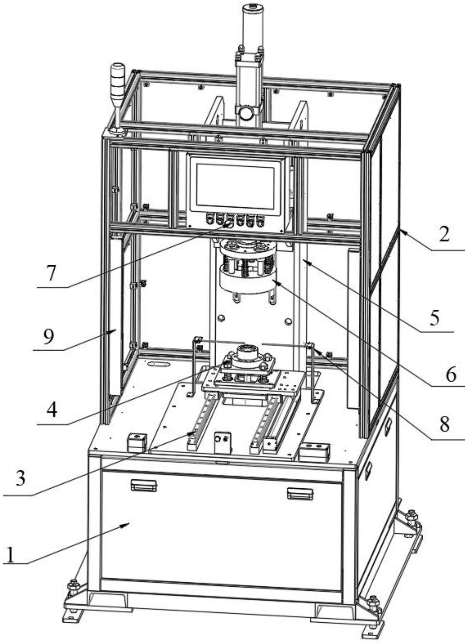 本实用新型涉及新能源电机转子装配技术领域,具体为新能源电机转子螺栓锁铆设备,包括工作台、防护架、上下料机构、定位工装、压头驱动机构和压头组件,所述定位工装伸入所述防护架后,所述压头组件设置于所述定位工装的正上方,所述压头驱动机构用于驱动所述压头组件上升或下降;实际应用中,将电机转子放在定位工装上,上下料机构驱动定位工装和电机转子移动至压头组件的正下方,压头驱动机构驱动所述压头组件下降的过程中,通过压头组件将螺母上的挡片铆压到电机转子轴上的槽口中;本实用新型通过对电机转子螺母的自动铆压,提高生产效率,节约人力成本,还能有效防止铆压不到位的状况,提高了整机装配后电机转子的性能。