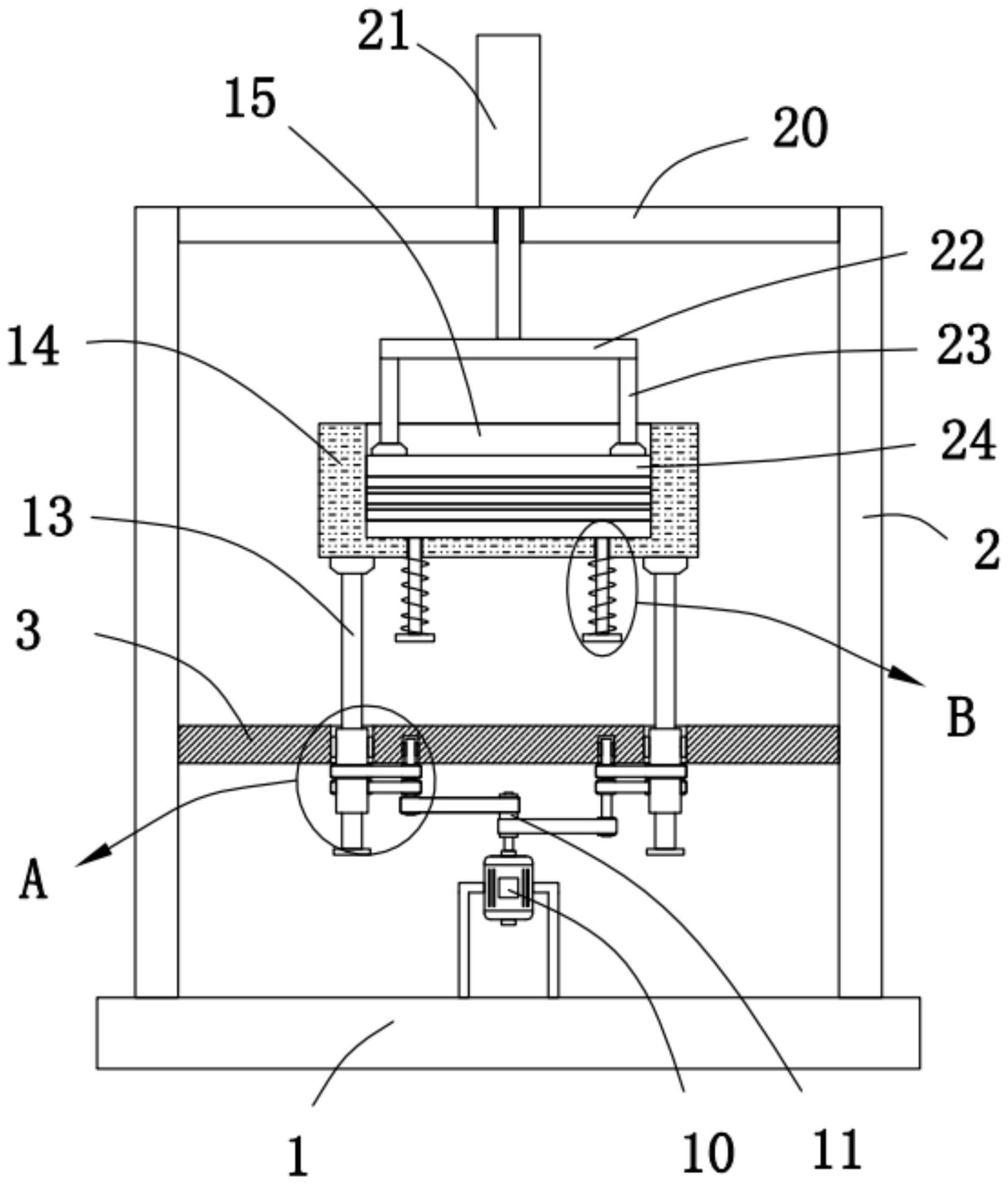 本发明提供一种层数便于调节的高频混压板叠板设备。所述层数便于调节的高频混压板叠板设备包括底座;两个第一支撑板,两个所述第一支撑板对称固定安装在所述底座的顶部;第二支撑板,所述第二支撑板位于两个所述第一支撑板之间,且所述第二支撑板与两个所述第一支撑板固定连接;四个螺纹套管,四个所述螺纹套管呈环形固定安装在所述第二支撑板上;四个第一皮带轮,四个所述第一皮带轮分别固定安装在四个所述螺纹套管的外侧;两个转动杆,两个所述转动杆对称转动安装在所述第二支撑板的底部。本发明提供的层数便于调节的高频混压板叠板设备具有使用方便、操作简单,可对不同层数的高频混压板进行叠板的优点。