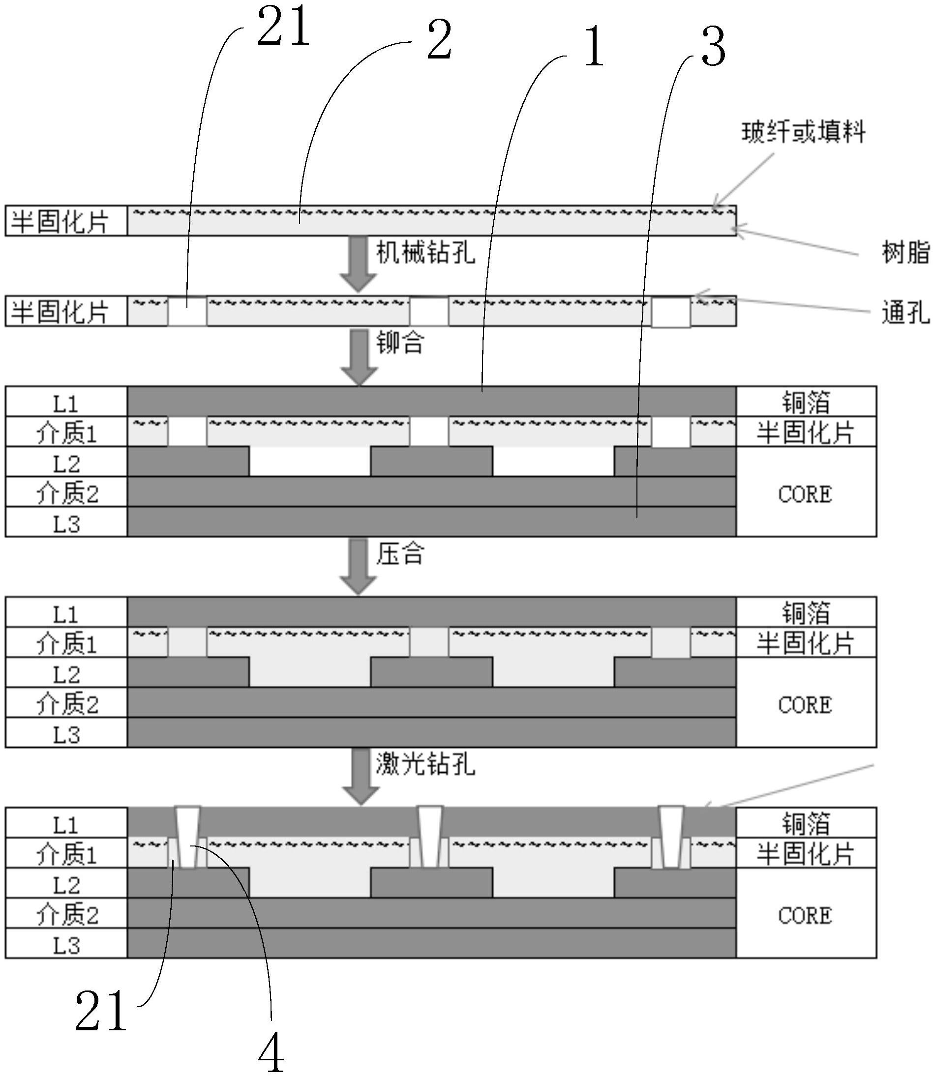 本实用新型提供本实用新型提供一种激光钻孔更容易实现的PCB板。本实用新型提供的PCB板,包括PCB板主体和设置于PCB板主体上的盲孔,PCB板主体包括层叠设置的第一铜层、半固化片和芯板,盲孔依次贯穿第一铜层和半固化片,且与芯板连接,半固化片上设置有预钻孔,预钻孔贯穿半固化片,盲孔设置于预钻孔中。本实用新型提供的PCB板,半固化片上设置有预钻孔,盲孔开设在预钻孔中,实现降低激光钻孔的难度,使得盲孔容易开设,半固化片的厚度可不受规格限制,使得半固化片2的材料选择和厚度选择不受限制。