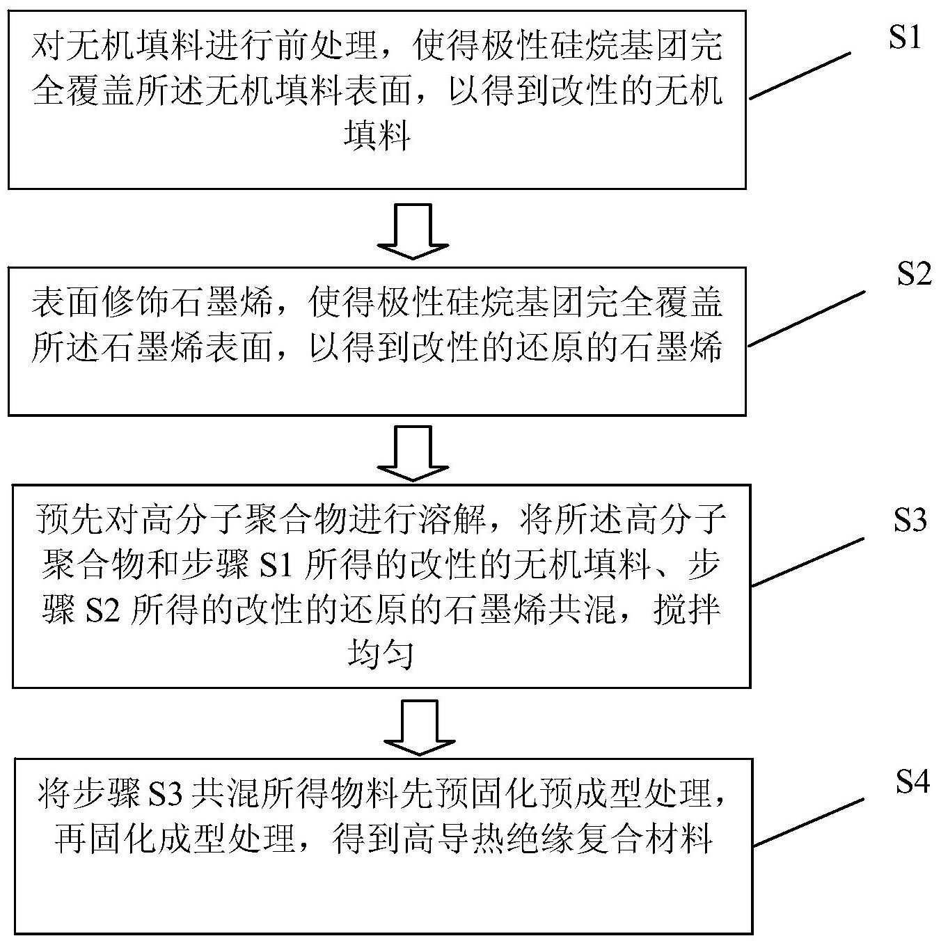 本发明涉及一种高导热绝缘复合材料的制备方法,其特征在于,包括以下步骤:对无机填料进行前处理,使得极性硅烷基团完全覆盖无机填料表面,以得到改性的无机填料;表面修饰石墨烯,使得极性硅烷基团完全覆盖石墨烯表面,以得到改性的还原的石墨烯;预先对高分子聚合物进行溶解,然后将其和所得的改性的无机填料、所得的改性的还原的石墨烯共混,并搅拌均匀;将上一步骤共混所得物料先后预固化预成型处理、固化成型处理,得到高导热绝缘复合材料。依据本发明提供的制备方法,制备得到的复合材料的导热性能得到有效提高,同时依旧维持良好的绝缘性。
