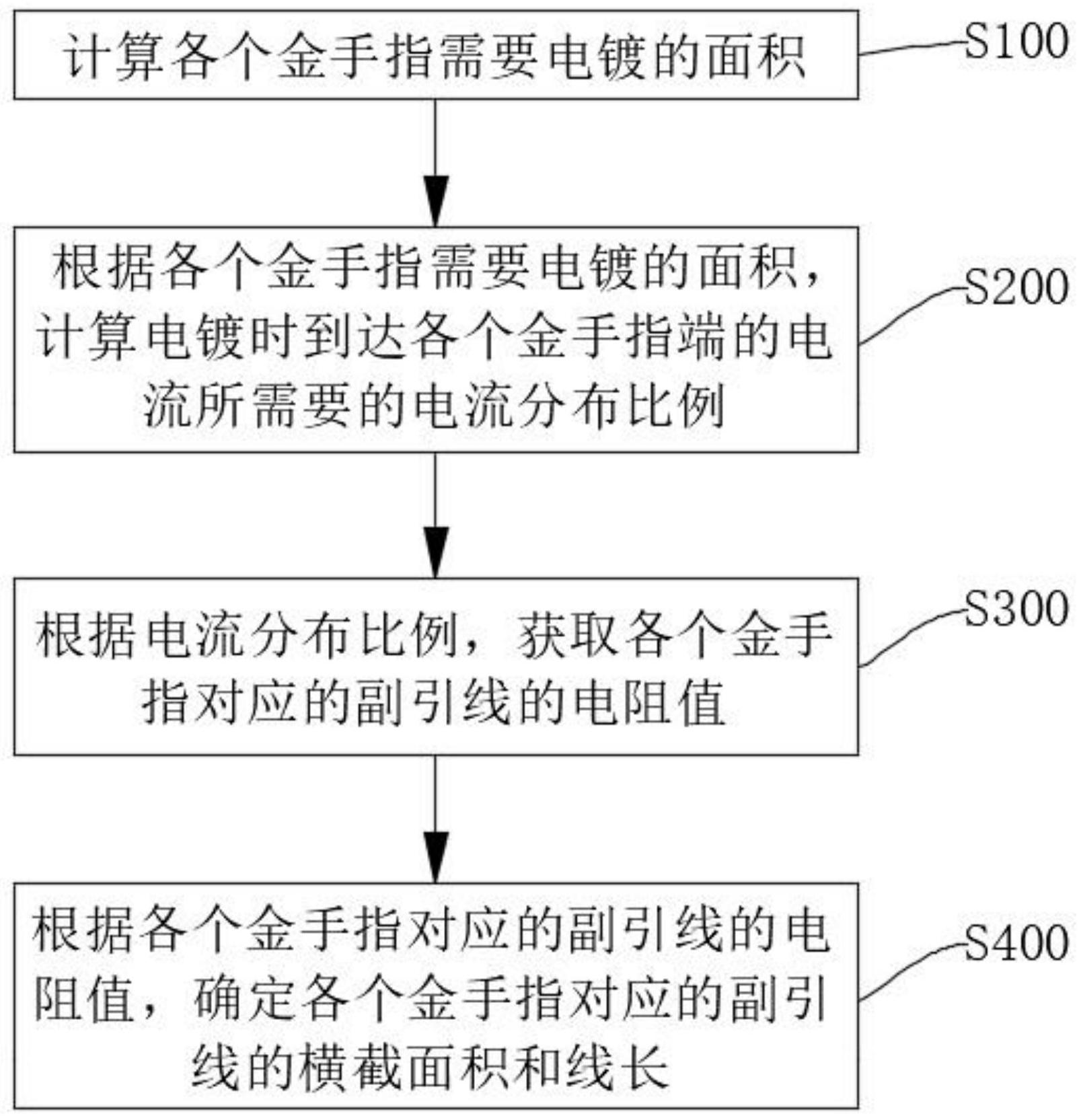 本申请涉及电路板技术领域,提供了一种金手指引线设计方法、金手指引线结构及电路板。该金手指引线设计方法包括:计算各个金手指需要电镀的面积;根据各个所述金手指需要电镀的所述面积,计算电镀时到达各个所述金手指端的电流所需要的电流分布比例;根据所述电流分布比例,获取各个所述金手指对应的副引线的电阻值;根据各个所述金手指对应的所述副引线的所述电阻值,确定各个所述金手指对应的所述副引线的横截面积和线长。本申请实施例提供的金手指引线设计方法可以使得金手指镀层厚度更加均匀。