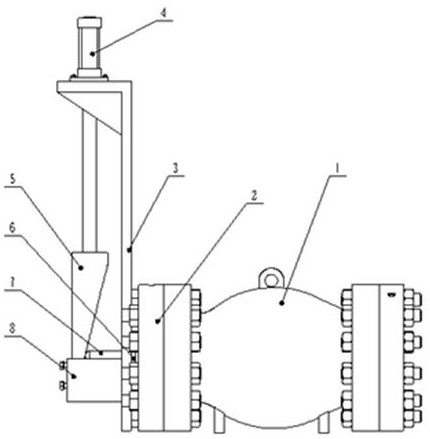 一种轴流式止回阀低温工况下带压启闭工装,盲板封堵轴流式止回阀两端,使轴流式止回阀形成封闭的空间,一端的盲板中心贯通密封安装顶杆,该顶杆一端和止回阀的导向杆连接,另一端和推力杆接触连接,且推力杆上的接触面为斜面,所述推力杆安装在支撑架组件上,其和安装在支撑架组件上的气缸的输出轴连接。本实用新型装夹快捷方便省力,为可靠性设计、可靠性预测、改进新产品质量和确定试验条件等提供依据;提高了阀门试验的效率,降低了阀门的生产成本。整个试验过程实现了工况模拟、开闭自动、操作简单。