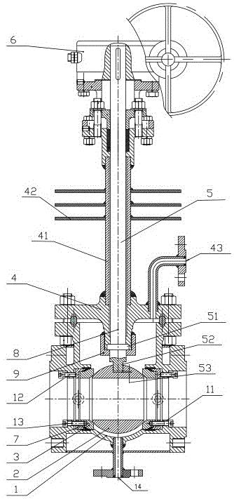 一种上装超高温球阀,独特的阀座与阀体密封结构代替石墨密封,解决石墨密封高温氧化问题,同时解决了超高温状态的普通弹簧问题;巧妙的设计凸台,固定阀座和预紧阀座,达到密封预紧比压,通过设计巧妙的限位帽设计解决了高温加长阀盖和阀杆膨胀顶死球体问题,阀门的关闭和全开状态的吹扫,解决颗粒和粉末的卡阻问题;夹套水冷设计,解决异常升温到1000℃时阀体强度问题,增加安全保障,解决了阀门热膨胀的卡阻问题。