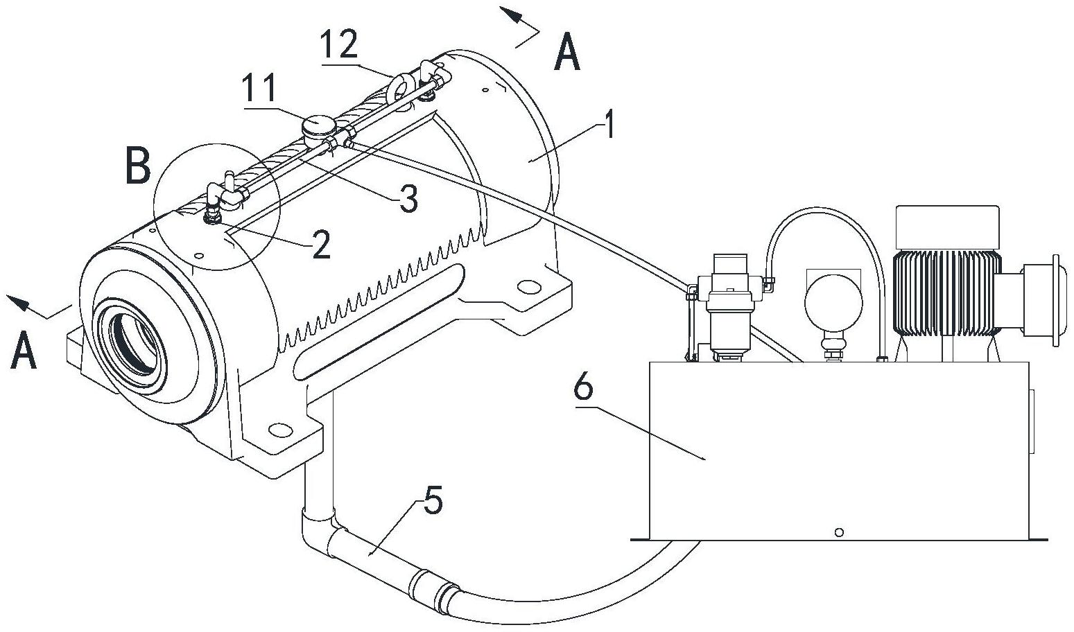 本实用新型涉及一种传动箱油路润滑系统,包括有液压油站,固定在所述壳体顶部、临近两个轴承位置处的两个喷淋装置,连接喷淋装置与液压油站的进油管路,设置于所述壳体的底部的油槽,以及连接油槽和液压油站的出油管路,喷淋装置截面大致呈“L”型,包括有喷头,所述喷头的顶端外侧开设有喷嘴,所述喷头的下端固定有螺帽,螺帽上与所述喷嘴同侧的位置处设置有标记孔,安装时确保标记孔正对轴承的方向,以保证喷嘴正对着轴承进行喷淋。在本实用新型中,在传动箱上增加喷淋装置,对运行中的轴承进行喷淋润滑油,起到润滑和降温的作用;在箱体底部打孔增加接头,保证接头插入深度约与正常油位线持平,保证箱体内部不会出现缺油现象。