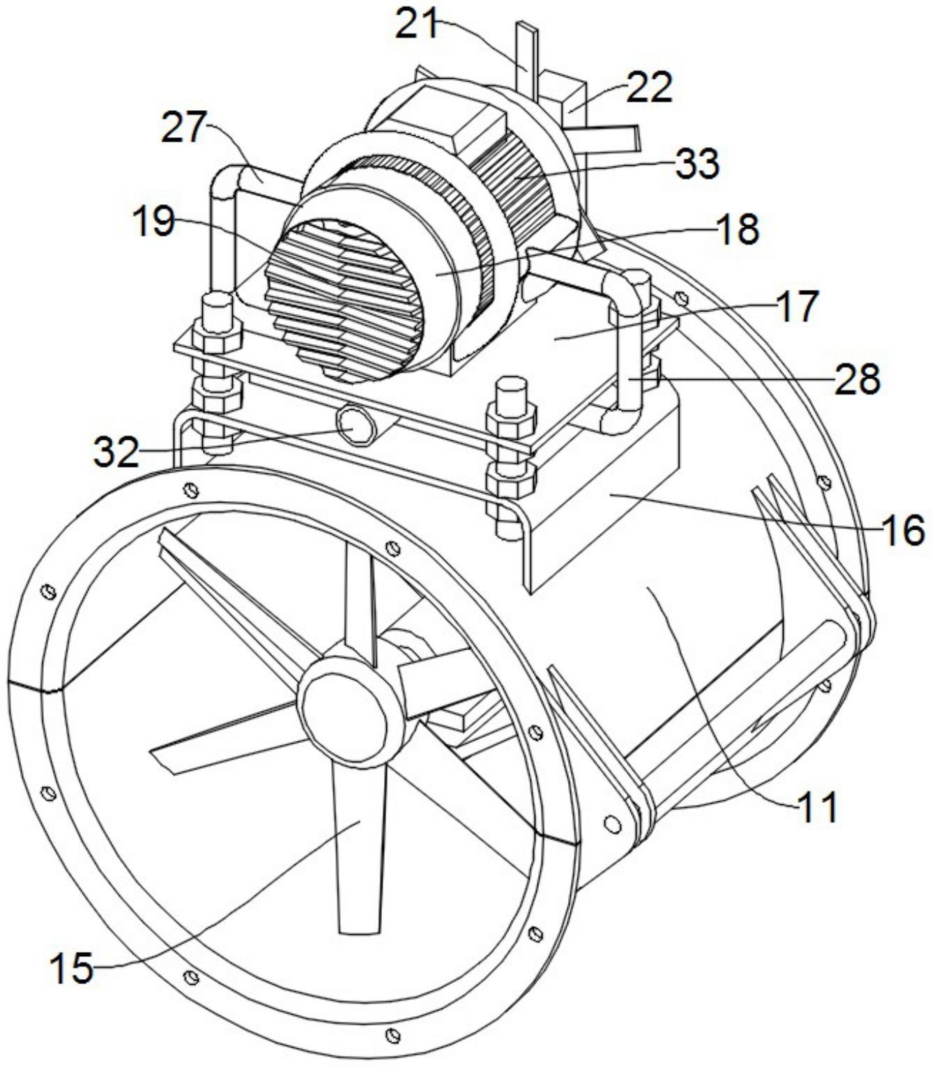 本申请公开了一种高效散热的防腐轴流风机,其属于轴流风机技术领域。一种高效散热的防腐轴流风机,包括:风筒;第一扇叶设于风筒内;驱动电机设于风筒上;第一支架固定连接于风筒上;第一散热片固定连接于驱动电机上;第二散热片固定连接于驱动电机上;驱动轴固定连接于驱动电机的输出转轴上;第二扇叶固定连接于驱动轴上;联动组件设于风筒上;储水箱固定连接于第一支架顶壁上;进水管连接于储水箱上;水泵固定连接于储水箱内;出水管一端与水泵的出水口连接;连接管与出水管另一端连接;环形水管套在驱动电机上并与连接管连通;回水管一端固定连接于储水箱上且另一端与连接管连通。本申请的有益效果在于提供了一种高效散热的防腐轴流风机。