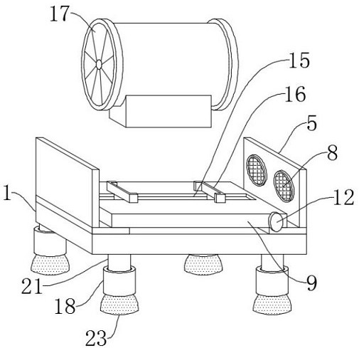 本实用新型公开了一种风机用稳固支撑底架,包括底座,所述底座内壁两侧均开设有第一滑槽,所述第一滑槽内部滑动连接有移动滑板,两个所述移动滑板之间固定连接有置物托板,所述置物托板与底座内部相匹配,所述底座顶部固定连接有防护挡板。本实用新型当风机需要进行使用时,将风机本体放置于支撑底板的顶部以及两个调节夹板之间,转动动力杆,时动力杆提高第二轴承带动第二锥齿轮转动,从而使第二锥齿轮带动第一锥齿轮转动,进一步带动调节螺杆通过第一轴承进行转动,由于调节螺杆外壁两侧的螺纹为反向设置,从而转动的同时带动连接套环反向转动,使调节夹板在第二滑槽中进行反向移动,进一步对风机本体进行固定。