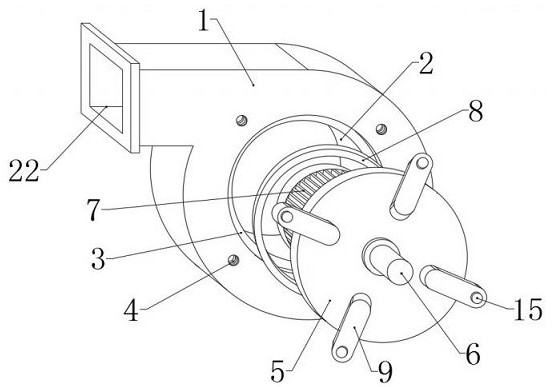 本实用新型公开了一种可更换垫片的新型风机,包括风机外壳,所述风机外壳内壁开设有安装槽,所述安装槽内壁一侧开设有装配孔,所述风机外壳内壁靠近装配孔一侧开设有安装螺孔,所述安装螺孔的数量设置为多个,多个所述安装螺孔呈环形均匀分布在风机外壳内壁一侧。本实用新型通过将橡胶降噪垫片套在叶片主体外壁,然后将叶片主体插入安装槽内部,固定螺栓与安装螺孔螺纹连接将叶片安装盘与风机外壳进行安装固定,弹簧分别与消声垫片和锁紧螺孔相抵,从而向锁紧螺孔内壁和风机外壳的内壁施加水平推力,使定位环进行挤压消声垫片,减小叶片主体与风机外壳之间的摩擦碰撞,减小了叶片主体的振动噪音,延长了风机的使用寿命。