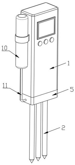 本发明公开了土壤肥料检测装置,涉及土壤检测技术领域,包括盒体,盒体底部滑动连接有多个检测插杆,盒体内部设置有控制检测插杆收放的控制机构,盒体底部设置有用于对多个检测插杆进行清理的清理机构,清理机构包括安装盒、分隔板、多个用于对所有检测插杆进行清理的清理组件和用于驱动多个清理组件进行转动的传动组件,安装盒固定在盒体底端,分隔板固定在安装盒内部,安装盒内部开设有若干个供所有检测插杆通过的通槽,所有清理组件分别一一对应设置在多个通槽内,本发明通过清理组件与检测插杆接触后将检测插杆表面的土壤刮除干净,从而保证检测插杆的干净整洁,避免检测插杆表面土壤粘附过多影响下一次土壤检测的质量。