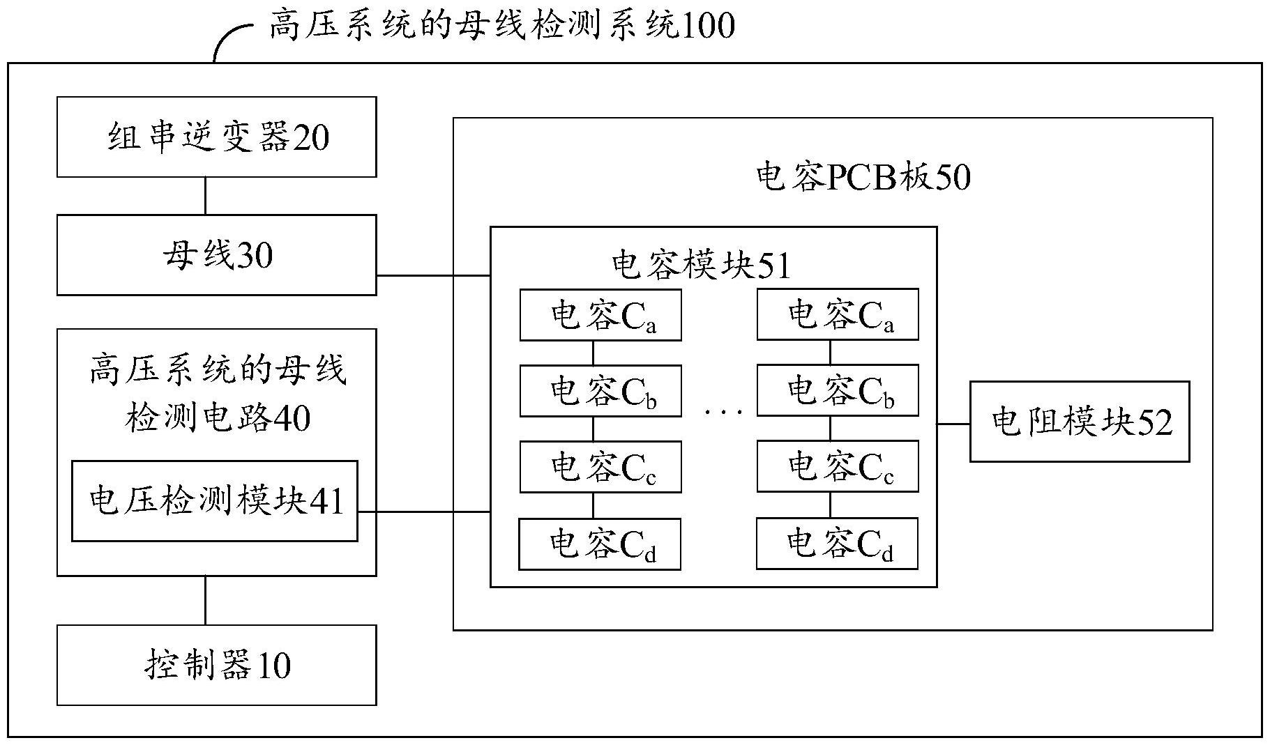 本实用新型涉及高压系统的技术领域,提供一种高压系统的母线检测电路及电容PCB板,该电路应用于电容PCB板,电容PCB板包括至少两组电容模块和电阻模块,电容PCB板与母线连接,至少两组电容模块通过第一预设连接方式焊接在电容PCB板上,基于此,即可使每一组电容所流经的电流大小都相等。并且还通过电阻模块实现母线均压的目的。高压系统的母线检测电路包括电压检测模块,电压检测模块分别与至少两组电容模块和控制器连接;电压检测模块用于采集至少两组电容模块中首组电容模块的电压,并将所采集到的电压输出至控制器,以使控制器根据电压确定母线的正、负电压是否平衡。基于此,即可在母线电压不均衡时,实现报警功能,进而实现了母线电压的过压保护。