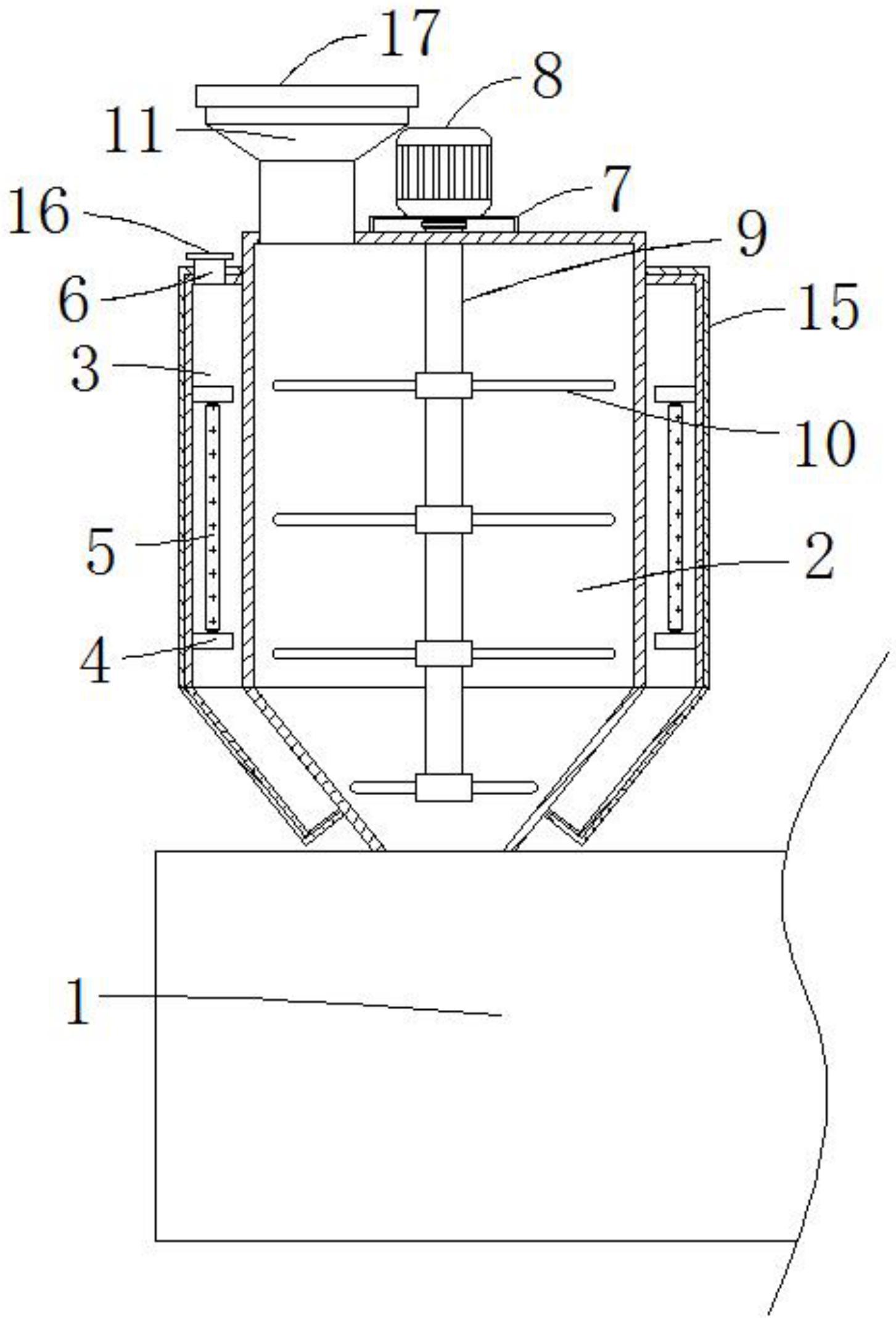 本实用新型涉及挤出机技术领域,且公开了一种进料顺畅的单螺旋挤出机,包括挤出筒及储料斗,储料斗的下端与挤出筒的上端左侧固定连接,储料斗的外侧壁固定套接有环形蓄水箱,环形蓄水箱的左右内侧壁上下两端均固定连接有支撑块,且同侧两个支撑块之间均固定设有电热管,环形蓄水箱的上端左侧固定连接有进水管,储料斗的上端固定连接有U形板,且U形板的上端固定连接有电机,电机的输出端通过联轴器转动连接有转轴,转轴的轴壁依次贯穿U形板的上端及储料斗的上端并延伸至内部。本实用新型可以防止原料因温度散发变硬粘稠,影响挤出的顺畅性,且可以使原料混合的更加充分,同时可以均匀加热,加热效果好。