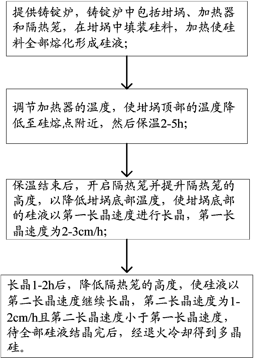 本发明提供了一种铸锭过程中去除多晶硅杂质的方法,包括以下步骤:(1)提供铸锭炉,铸锭炉中包括坩埚、加热器和隔热笼,在坩埚中填装硅料,加热使硅料全部熔化形成硅液;(2)调节加热器的温度,使坩埚顶部的温度降低至硅熔点附近,然后保温2‑5h;(3)保温结束后,开启隔热笼并提升隔热笼的高度,以降低坩埚底部温度,使坩埚底部的硅液以第一长晶速度进行长晶,第一长晶速度为2‑3cm/h;(4)长晶1‑2h后,降低隔热笼的高度,使硅液以第二长晶速度继续长晶,第二长晶速度为1‑2cm/h且第二长晶速度小于第一长晶速度,待全部硅液结晶完后,经退火冷却得到多晶硅。本发明提供的方法,在硅料熔化后进行保温,然后进行快速形核结晶,提纯效率高,提纯成本较低。